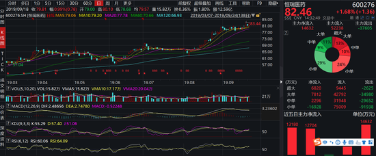 就如今天,我们发现,当所有药企都有不同程度的下跌时,恒瑞医药却大幅走高,几乎创出历史新高的83.44元,主力资金流入近1.5亿元。