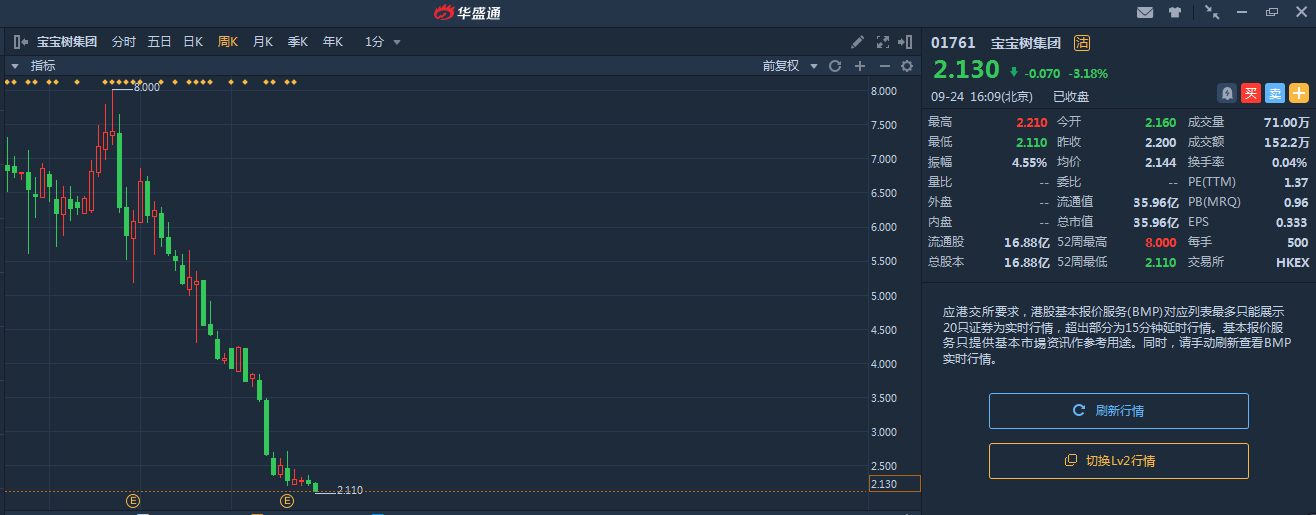 这家公司就是拥有无数名企“背书”的宝宝树集团,在2018年11月27日登陆港交所时,宝宝树股价曾经超过6.9港元,总市值超过115亿港元。但是随着业绩的持续下滑,宝宝树的股价呈现持续走低的趋势。截止到2019年9月24日收盘,宝宝树已经跌到2.13港元,市值已经蒸发了超80亿港元,占比近70%!