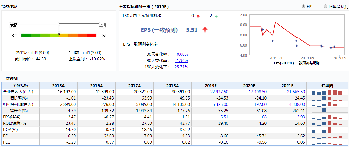 Wind数据显示,两家机构给出中性评级,一致目标价44.33美元,已低于周一收盘价49.60美元(-10.62%),从年初至今机构对公司19财年的EPS预期逐步下滑,年中开始企稳,目前一致预期全年EPS为5.51美元,对应的归母净利润为63.25亿美元,同比下滑55%,计算可知 Q4净利润预期为5.73亿美元,上年同期则为26.78亿美元。