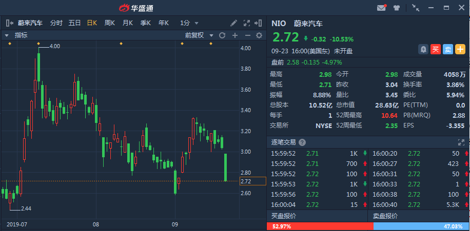 受此消息影响,周一美股收盘,蔚来股价大跌10.53%至2.72美元,市值缩水至28.58亿美元。