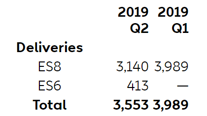 7月由于优先满足召回电池的生产因而显著影响了当月车辆的生产和交付,仅交付了837辆车。8月交付了1943辆车,其中包括146辆ES8和1,797辆ES6,截至2019年8月31日,交付总量达到21670辆。