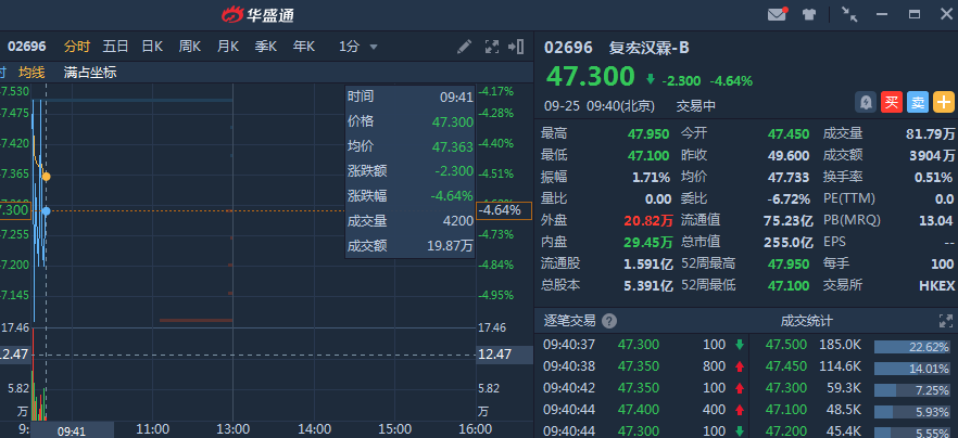 复宏汉霖-B首日挂牌,截至9时40分,跌4.64%,报价47.30港元 ,成交额3904万港元 ,最新市值255亿港元。