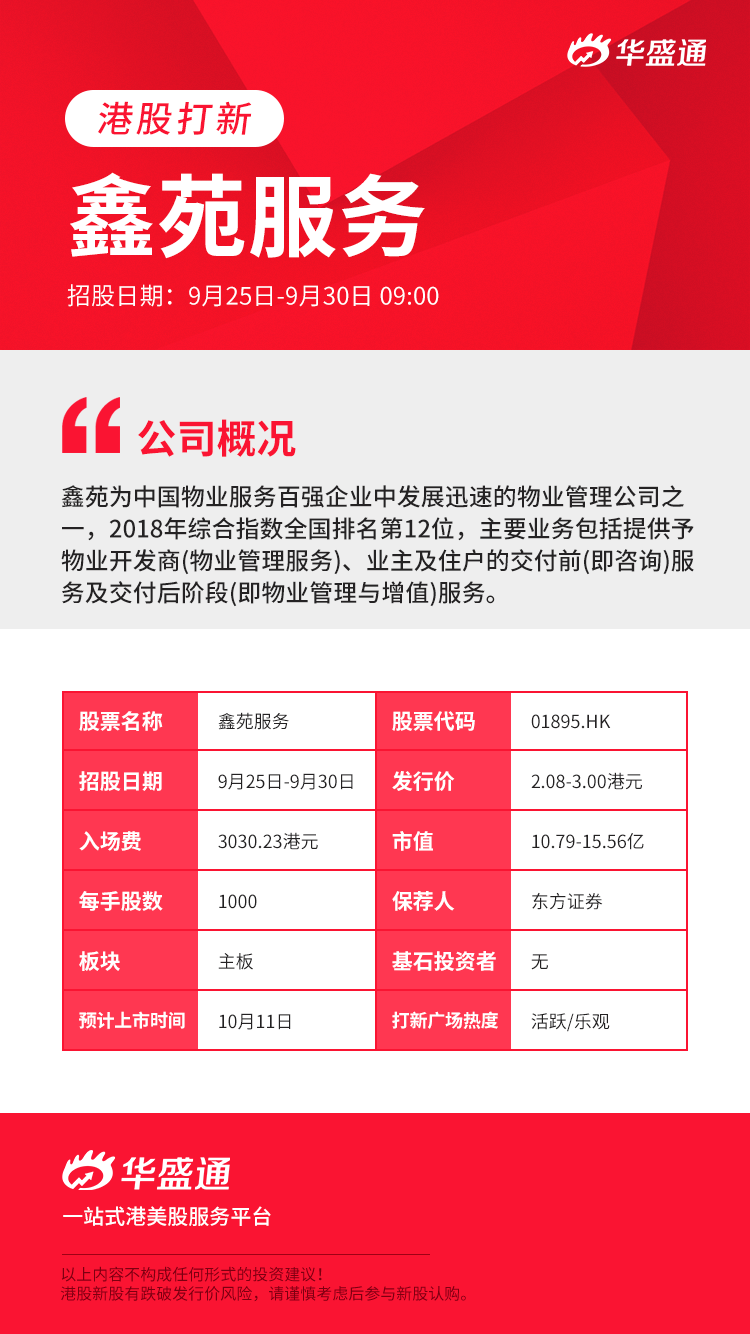 鑫苑服务(01895)于2019年9月25日-30日招股,公司拟发行1.25亿股,香港公开发售占10%,国际配售占90%。每股2.08-3港元,每手1000股,预期股份将于2019年10月11日上午九时正在联交所开始买卖。