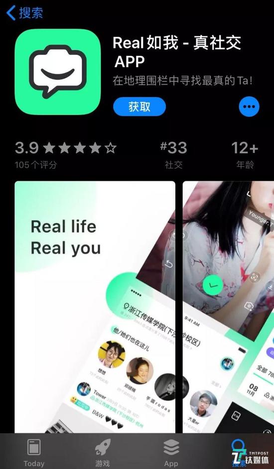 “Real如我”是一款校园社交应用,能够基于地理位置寻找好友,添加了人脸识别的扫脸功能,还添加了角色聊天等好玩的玩法。但该产品目前比较低调,需要内测码才能试用。