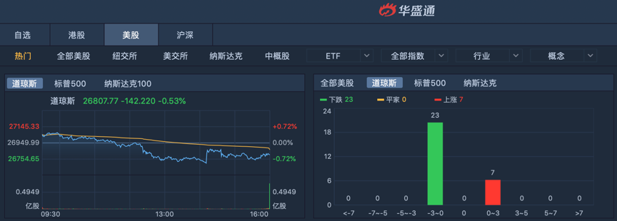 周二,美股整体高开低走。其中,道指收盘下跌0.53%,报26807.77点;标普500指数跌0.84%,报2966.60点;纳指跌1.46%,报7993.63点。