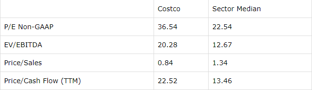 下表根据不同的估值比率将好市多与该行业的中位数进行了比较:市盈率,企业价值与EBITDA的比值,市销率以及价格与现金流量的比值。除市销率外,其他估值比率均显示好市多当前的股价相对于同行业一定的溢价。