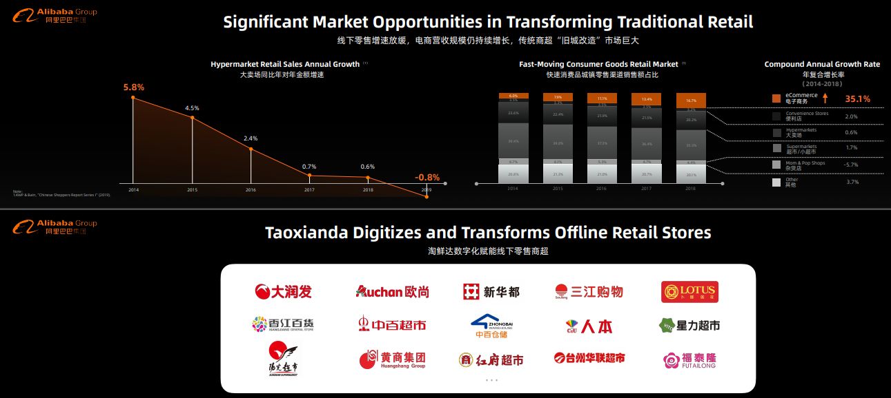 从今年的投资者大会看,公司的战略重点仍是核心电商,尤其是零售电商。天猫超市定位是“旧城改造”,中国庞大的零售市场之中,电商GMV增速仍然很高,要通过对落后的传统商超进行“旧城改造”来提效。会上给出“淘鲜达”对23个线下商超品牌进行数字化改造的例子,改造带来的增效明显。