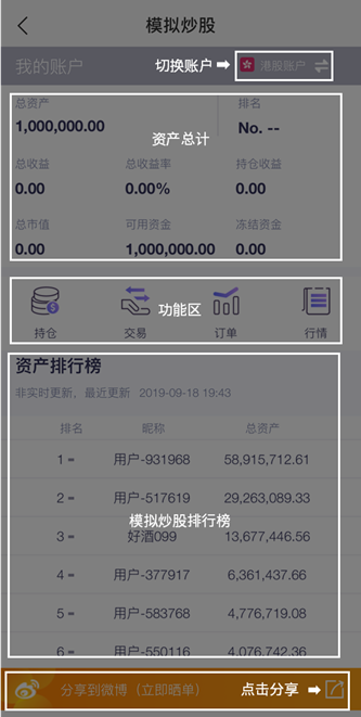 在华盛通中,我们可以在个股详情页底部栏点击更多,看到模拟炒股入口,也可以直接从发现页中进入。进入页面后,我们可以看到大致分为账户、资产收益表、功能区、排名区和分享几个模块,我们来逐一说说。