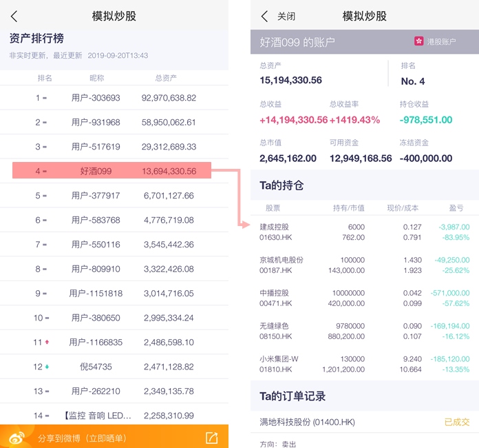 分享:点击分享,即可将自己模拟炒股的成绩分享到华盛通社区中,以及分享给好友们,你有多厉害,当然要全世界知道啦。
