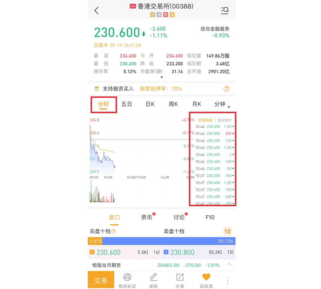 在个股详情页中,若我们的K线图选择分时,在K线图的右方则会出现逐笔明细和成交统计小图,展示给我们当前股票的交易情况,点击则可以进入详细页面。