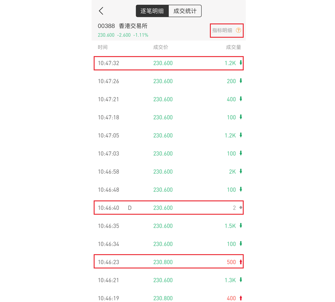 逐笔明细页面:展示不同时刻,股票以什么价格成交的情况,并附有成交量,红色代表买入为主,绿色表示以卖出为主,有部分显示为灰色。时刻后显示的字母含义,可点击页面中“指标明细”旁边的问号或者点击这里学习~