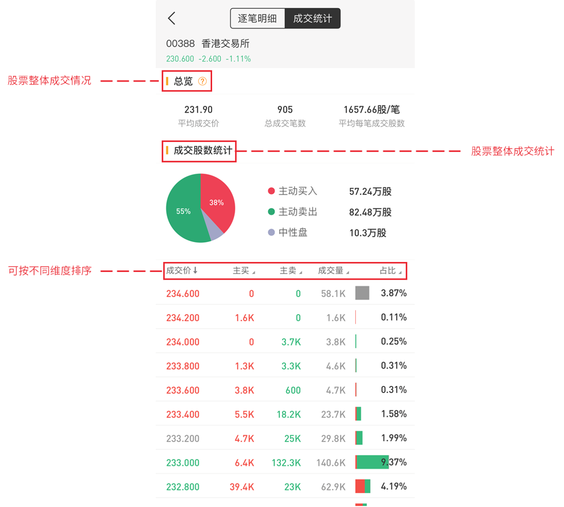 成交统计页面:可以一览股票成交的总情况,总览是当前时间的总成交数据。而成交股数统计,则可以帮我们看到买入、卖出、中性盘的情况。最后下方还有成交情况分布,可以根据成交价、主买、主卖等维度进行排序,帮助我们更好地了解股票成交情况。