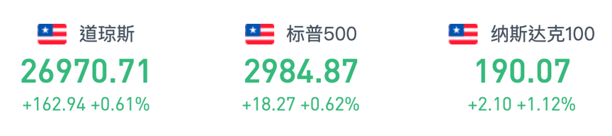 周三,美股在盘初下挫后逐步走强,最终集体收涨。其中,道琼斯指数涨0.61%,报26970.71点;标普500指数涨0.62%,报2984.87点;纳斯达克100涨1.12%,报190.07点。