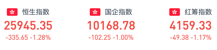 恒生指数开盘跌0.45%,早盘曾现探底回升,随后全天单边下跌。截至收盘,恒生指数跌1.28%,报25945.35点,全日成交额达755.74亿。国企指数跌1%,报10168.78点,红筹指数跌1.17%,报4159.33点。