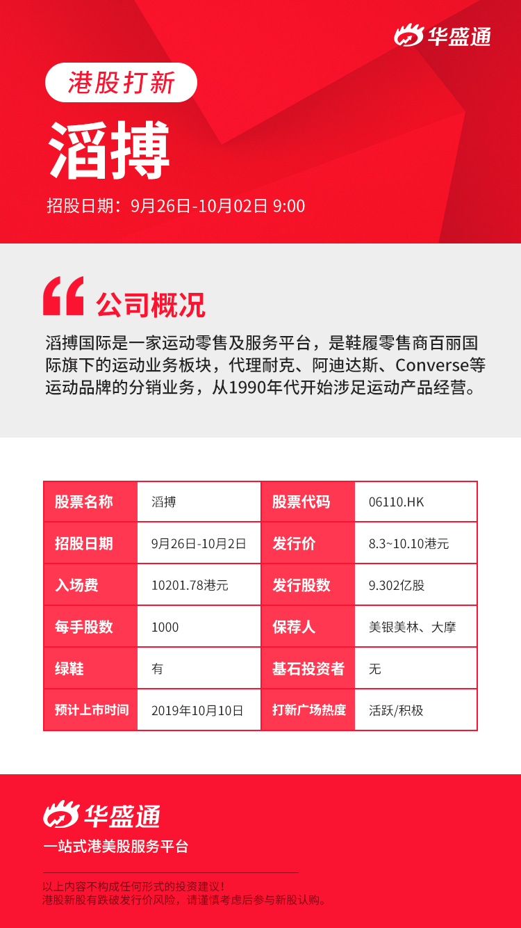 滔搏(06110)公布,该公司拟于2019年9月26日至2019年10月2日招股,该公司拟发行9.3亿股,其中香港发售占10%,国际发售占90%,另有最多15%超额配股权;配售价为每股发售股份8.3港元-10.10港元,每手1000股,预期股份将于2019年10月10日上午九时正开始在联交所买卖。