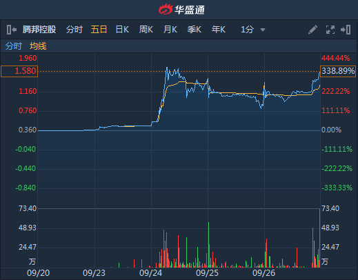 9月26日消息,腾邦控股今日再遭热炒,截至收盘,股价报1.58港元,涨81.61%,成交额2631万港元。该股上一次大涨是在9月24日,当日股价最高翻了三倍多。