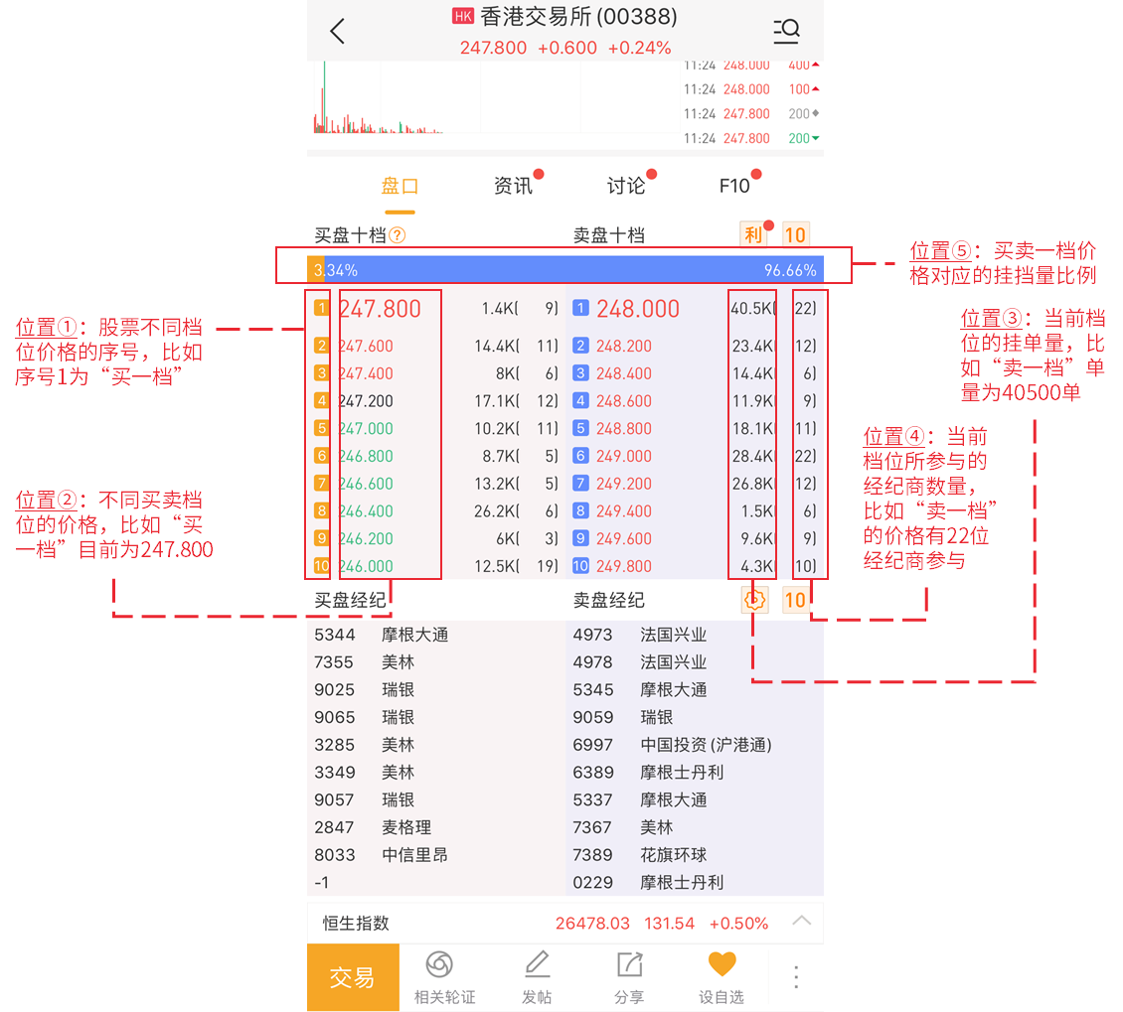位置④:经纪商数量,也就是括号中的数字,指的是在这一档价格中,有多少个经纪商参与其中。
