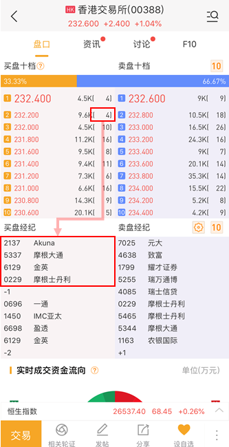 买卖经纪位于个股详情页中,处在买卖十档下方,一般我们需要跟着买卖十档来查看。如下图,买盘中的第一档,后面的数字是4,则表示有4个经纪商出价230.400想要买入股票,而买盘经纪中的前4位,就是那4个经纪商。“-1”表示从下面开始就是第二档,以此类推。而卖盘经济刚好相反,以“+”来表示。
