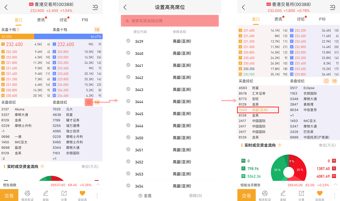 此外,买卖经纪商还有一个设置按钮,点击后我们可以为自己添加关注的经纪商,加入后返回个股详情页,如果关注的经纪商有在买卖盘经纪中,则会高亮显示,以防自己错过。