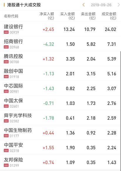 港股通资金今日净流入港股18.29亿元。今日净买入建行2.45亿港元,中国平安1.55亿港元,腾讯控股1.32亿港元。
