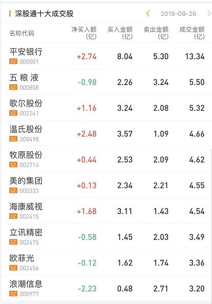深股通净买入平安银行2.74亿,净买入温氏股份2.48亿、海康威视1.68亿。
