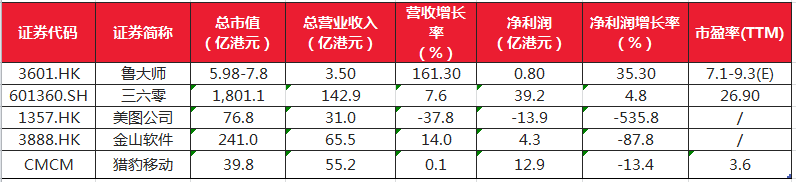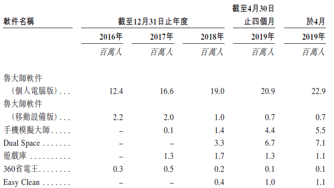 360鲁大师是中国最大的个人电脑和智能手机硬件及系统评测及监控解决方案供应商,旗下的“鲁大师”为国内硬件及系统监测的知名软件,按每月活跃用户(月活)算,鲁大师占个人电脑及移动设备的市场份额高达98.8%及58.9%。公司今年4月产品总月活约为1.25亿,其中多款软件产品月活达1.2亿,剩下游戏库拥有490万月活。