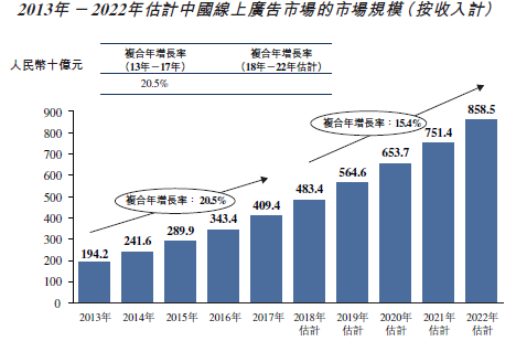 目前国内线上广告市场集中度较高,集中于阿里巴巴、腾讯、百度、头条及360等头部公司。公司目前收入主要来源于线上广告,与大股东360展开密切合作。受经济增长及互联网用户的增长带动,弗若斯特沙利文预计中国线上广告市场收入将从17年的4094亿元增至 2022的8585亿元,年复合增长率为15.4%。