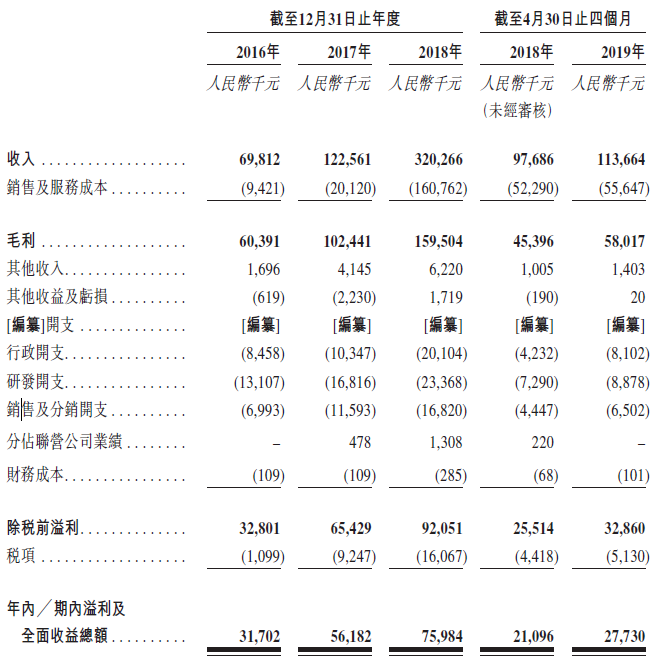 公司近年来营利保持增长,16年至2018年营收分别为6981万元、1.23亿元及3.2亿,两年增幅达358%,19年前四个月营收为1.14亿元,同比增幅约16%;目前,流量变现的线上广告和线上游戏业务仍是鲁大师收入的主力,不过占比逐年下滑,从16及17年的超98%降至18年的67.9%,19年前四个月比例回升至74.1%,原因在于电子设备销售因扩大业务线带来18年的爆发性增长。