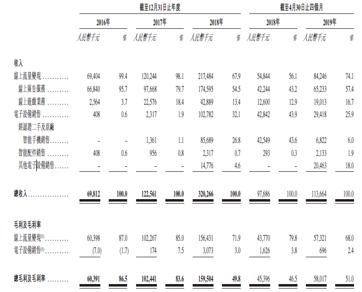 期间公司盈利同样持续增长,由16年的3170万元增至18年的7594万元,两年增幅达140%;19年前四个月盈利为2773万元,同比增幅为31.4%,快于收入增速。从成本分析, 前几年主要以流量变现成本为主,包括广告及推广开支及服务器租赁成本,占比接近90%,但18年上半年开始发生转折,智能手机销售剧增,流量变现成本占比下滑至22.3%。受益于电子设备销售业务的增长及盈利改善,整体毛利率持续提升。