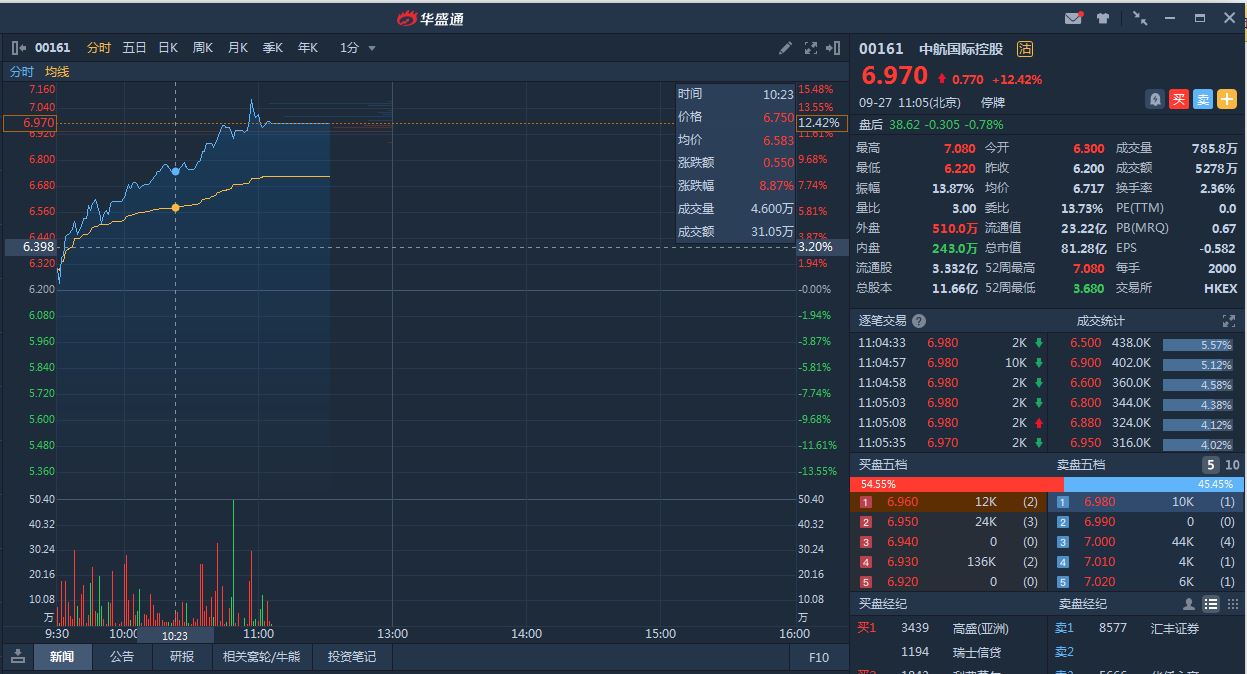 新浪港股讯 9月27日消息,中航国际控股(00161)股价攀升超12%,创一年半新高。盘中停牌,原因暂未披露。