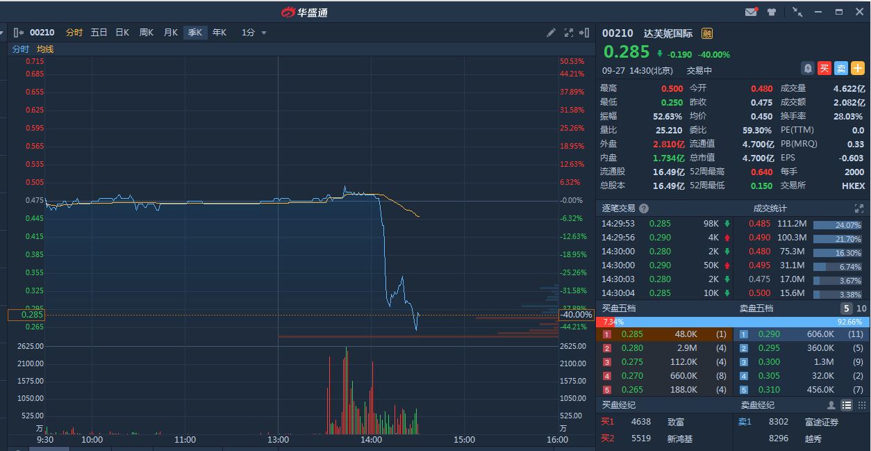智通财经APP获悉,达芙妮国际(00210)午后惨遭洗仓,放量闪跌40%。截至14时30分,跌40%,报价0.285港元,成交额2.082亿。