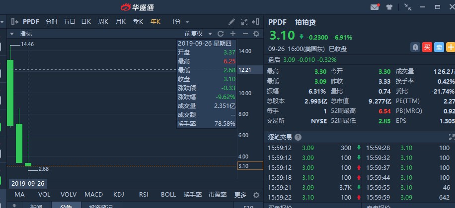 市场似乎提前感受到了消息,9月26日收盘,拍拍贷下跌-6.91%。拍拍贷,自2017年10月在美国纽交所上市,发行价13美元,到目前拍拍贷的股价已经到了3.1美元,最低之时到了2.66美元。拍拍贷自身的估值也一落千丈,到此时,滚动市盈率仅有2.27。