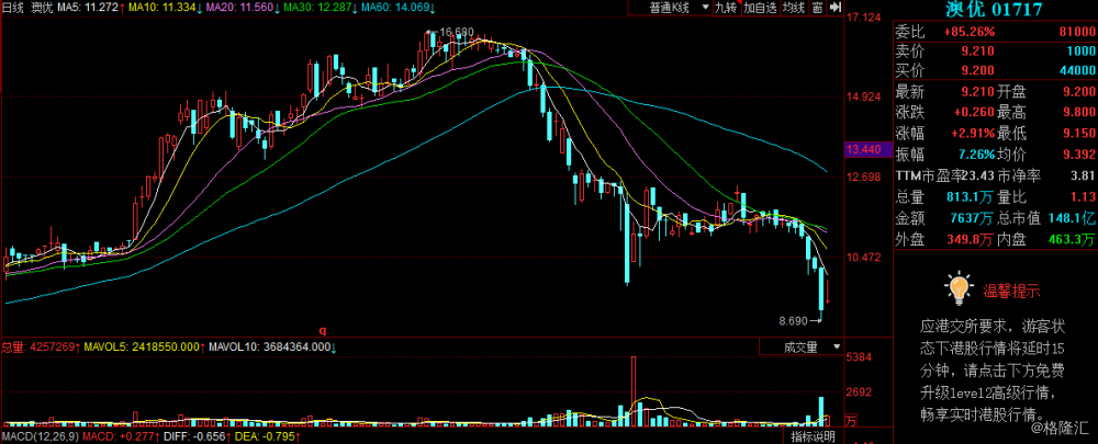 昨日,公司交易额突然从前一日的2500万港元突然暴增至2.0亿港元,导致股价大跌,其背后或有炒作的成分——至于持续看空澳优股价的原因,亦就很难揣测了。但目前公司股价已跌破所有均线。