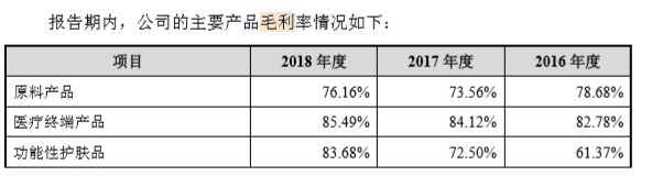 招股书数据显示,2016-2018年,华熙生物分别实现营业收入7.33亿元、8.18亿元以及12.63亿元,净利润分别为2.69亿元、2.22亿元以及4.24亿元。快速增长的业绩背后是超高的毛利率,华熙生物2016年-2018年的综合毛利率分别为77.36%、75.48%、79.92%,玻尿酸原材料毛利率也在75%左右,此毛利可媲美茅台。
