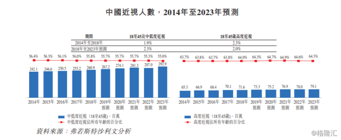 而根据弗若斯特沙利文报告显示,截止2018年末,中国90%的20岁年轻人患有近视,整体近视人数截至2017年达5.6亿人,同时高度近视人数2017年达1.1亿万人,且还在继续增长。与此同时,随着人口老龄化,中国45岁以上的老花眼总人数为3.91亿人,预期于2023年将达到4.61亿。