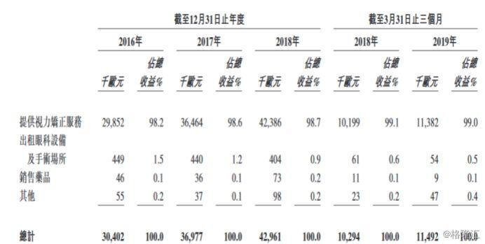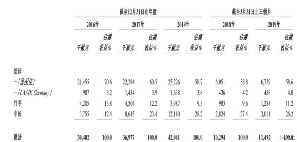 其中,值得留意的是,目前,视力矫正服务为公司核心业务及最主要的收入来源。招股书显示,2016-2018年,公司总收益从3040.2万欧元增至4296.1万欧元。期间视力矫正业务的收入占比始终保持在98%以上。
