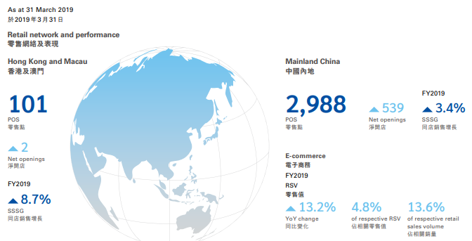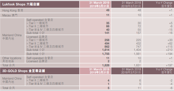 截至2019年3月31日,周大福共拥有3089家门店,其中中国内地2988家,比去年同期增加了539家新店。