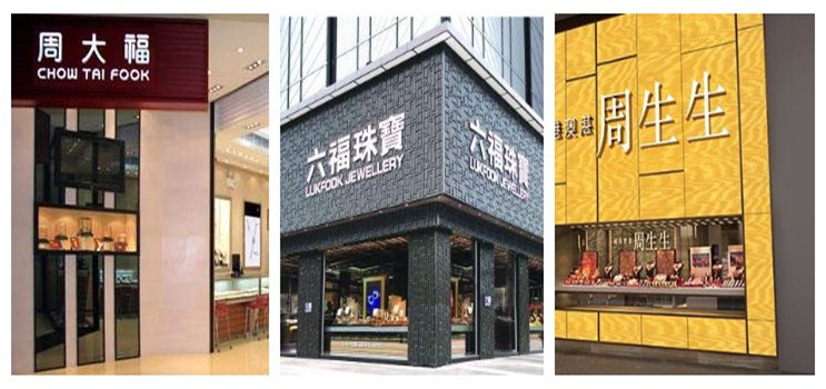 周大福于1929年诞生于广州,是三家企业中历史最悠久的。1939年开设香港首间周大福珠宝金行,2011年在港交所上市,被称为香港第一珠宝品牌。