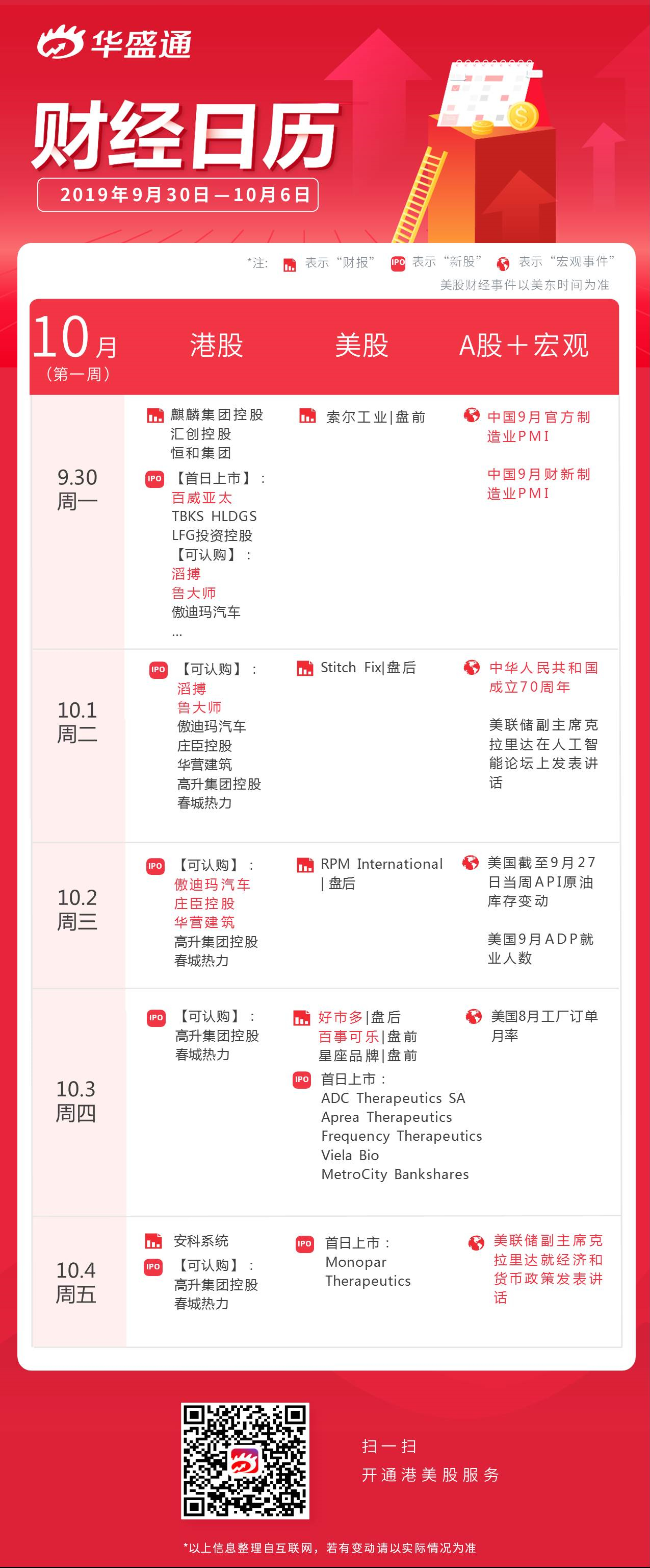 1. 本周迎来国庆黄金周,港股周二休市,美股正常开市;