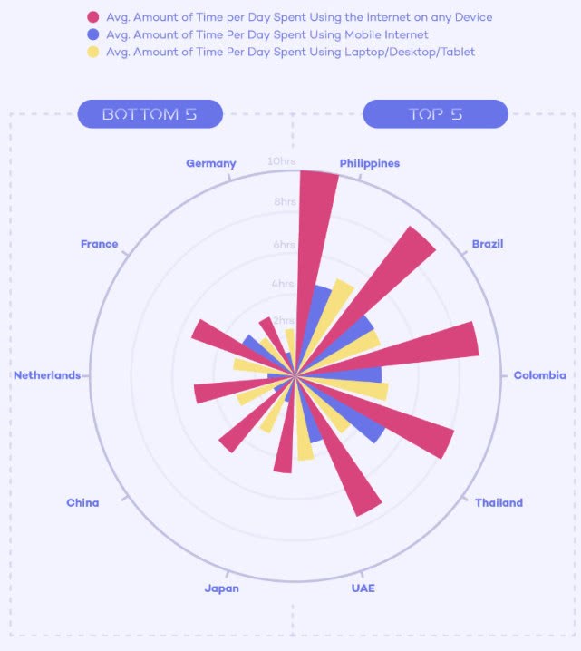 巴西、哥伦比亚和泰国这三个国家的用户,每天上网时间也在9个小时以上。美国人平均每天花费6小时31分钟使用互联网,在全球排名第12。