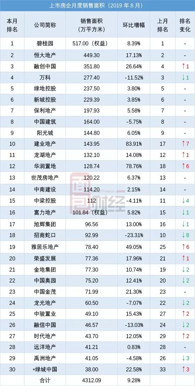 原标题:TOP30上市房企8月销售面积排行:万科退出前三,绿城新入榜 来源:面包财经