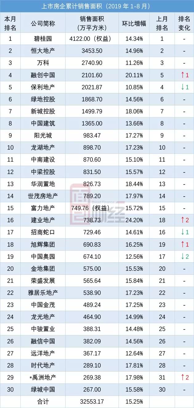 1-8月累计销售面积TOP30排名:4家上升,3家下降