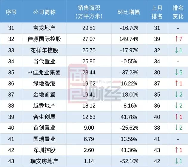 累计销售面积进入前30名的上市房企,有4家排名较上月上升,3家排名下降;23家排名与上月持平。