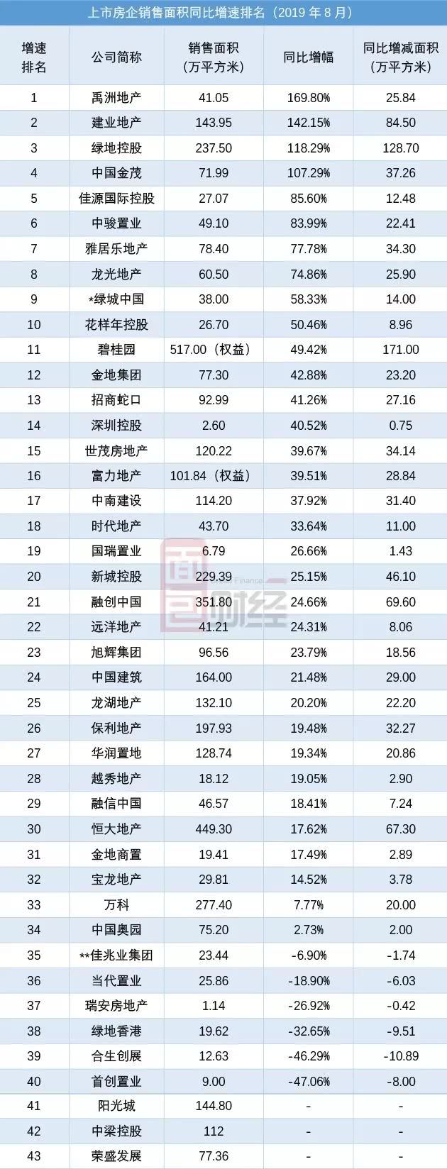 2019年8月同比涨幅最大前5名房企分别为:禹洲地产(169.80%)、建业地产(142.15%)、绿地控股(118.29%)、中国金茂(107.29%)、佳源国际控股(85.60%)。