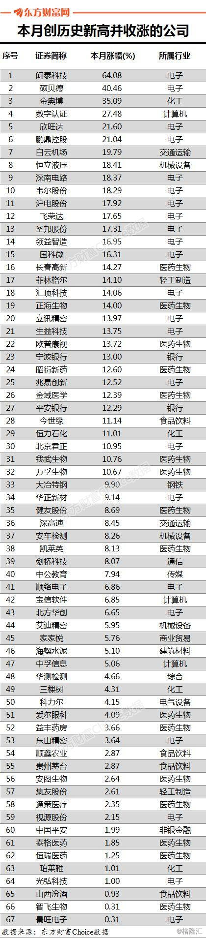 东方财富Choice数据显示,截至9月27日,本月共67家公司创出历史新高(不含次新股以及9月股价下跌的公司)。