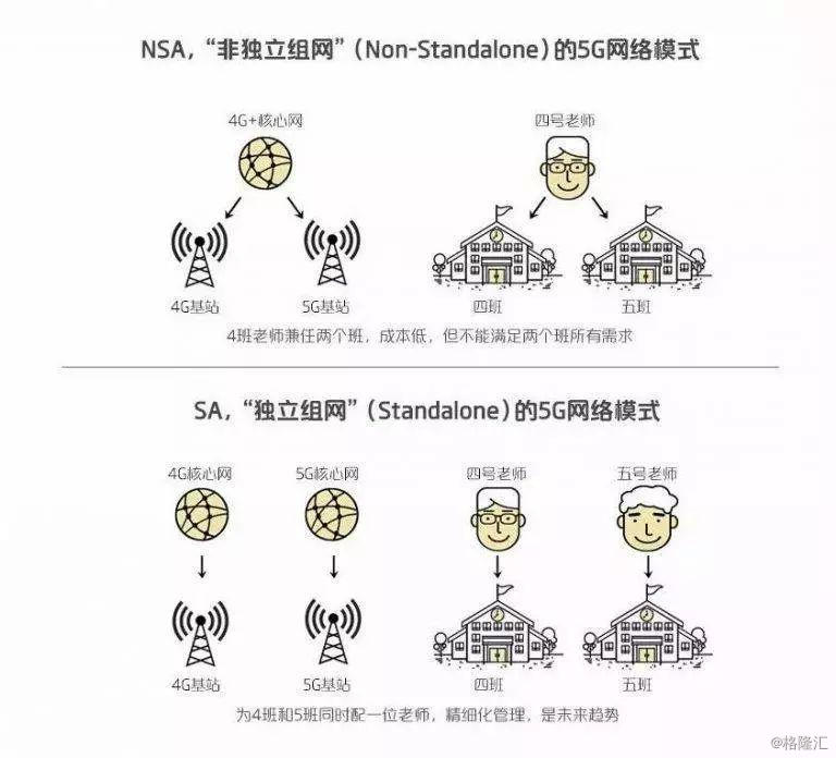 NSA 非独立组网,是在 4G 基站的基础上升级而来,核心网仍是 4G,因此布设快,成本低;而 SA 独立组网,则是完全按照 5G 的新标准新建基站,时延、连接数等指标上都大幅领先 NSA 组网,但代价是成本高昂,目前技术和标准仍不完善。