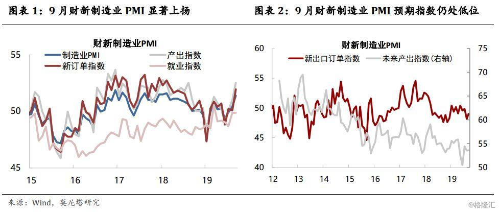2019年9月,财新中国制造业PMI录得51.4,较上月增长1个百分点,连续第三个月反弹,创2018年3月以来最高。9月中国制造业景气度继续呈改善迹象,主要得益于国内需求的潜在增强,而中美贸易冲突对于出口、生产成本及企业家信心都仍施加着明显冲击。而相对于订单的改善而言,就业扩张偏慢,可能侧面反映出结构性失业的状况。近期中央政策强调“形成强大国内市场”,随着基建项目的加快落实、产业升级的更积极推进、减税降费红利的继续释放,有望抵消外需疲软的影响,缓和中国经济下行压力。