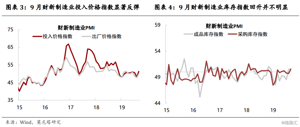 1、需求较上月显著改善。9月制造业新订单指数显著抬升,尽管相对历史增速仍相对低迷,但已是2018年4月以来最高。受访厂商表示,其主要推动该因素是客户潜在需求改善。新出口订单从上月低点反弹,但仍处于荣枯线以下,受访厂商普遍反映,中美贸易争端持续,继续拖累出口销售。从而9月制造业需求增长主要来自国内,可能主要对应于基建投资的加快落地、以及房地产投资保持较快增长。