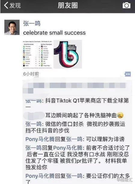 2018年5月,张一鸣在朋友圈发文庆祝抖音国际版Tik tok取得“small success”,并留言称“微信的借口封杀,微视的抄袭搬运,挡不住抖音的步伐”。马化腾随即回复“可以理解为诽谤”。之后双方相互起诉。