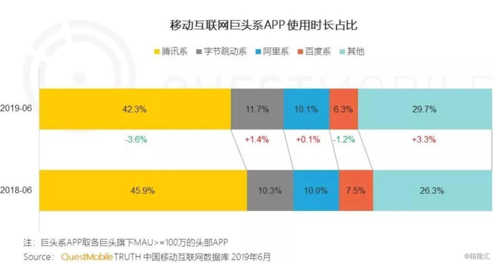 单纯的社交通讯工具,难以撼动腾讯的根基,不过短视频实实在在影响了社交通讯市场的发展。QuestMobile统计显示,在2018年上半年,用户使用短视频的时间占比大幅增长至8.8%,而即时通讯领域的用户时间占比大幅缩水。在今年上半年,移动互联网巨头系App使用时长占比中,腾讯系缩水3.6个百分点的总用户时长,字节跳动系则增加1.4个百分点。
